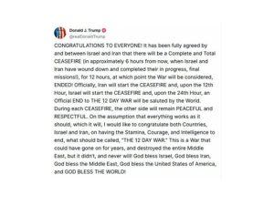 ایک غیر متوقع اور ڈرامائی پیش رفت میں امریکی صدر ڈونلڈ ٹرمپ نے دعویٰ کیا ہے کہ ایران اور اسرائیل کے درمیان مکمل اور حتمی جنگ بندی پر اتفاق ہو گیا ہے، جس کے تحت آئندہ 6 گھنٹوں میں دونوں ممالک اپنی عسکری کارروائیاں روک دیں گے۔
