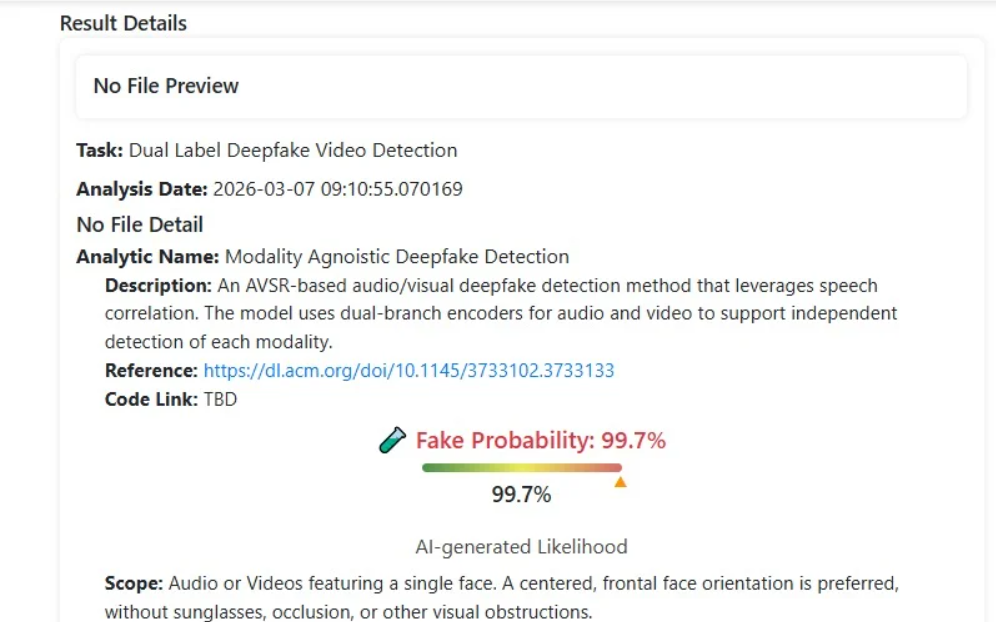 جیو فیکٹ چیک نے یونیورسٹی ایٹ بفیلو کے ٹول ڈیپ فیک او میٹر (DeepFake-o-Meter) کے ذریعے بھی اس وائرل کلپ کا تجزیہ کیا۔ اس ٹول کے نتائج میں ویڈیو کے جعلی ہونے کا امکان 99.7 فیصد ظاہر کیا گیا، جو اس بات کی واضح نشاندہی ہے کہ یہ ویڈیو مصنوعی ذہانت (AI) کے ذریعے تیار کی گئی ہے۔