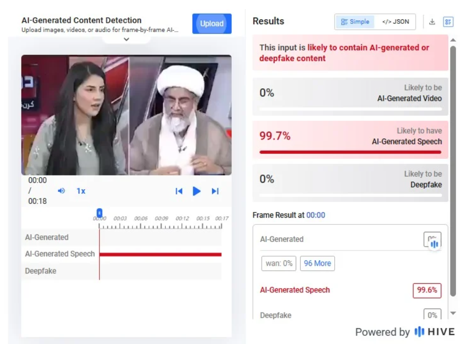 اس کے علاوہ، آرٹیفیشل انٹیلیجنس (AI) مواد کی شناخت کرنے والے پلیٹ فارم ہائیو ماڈریشن (Hive Moderation) نے بھی اس ویڈیو کلپ کو 99.7 فیصد کا مجموعی اسکور دیا ہے، جو اس بات کی تصدیق کرتا ہے کہ یہ مواد مصنوعی ذہانت کے ذریعے تیار کیا گیا ہے۔